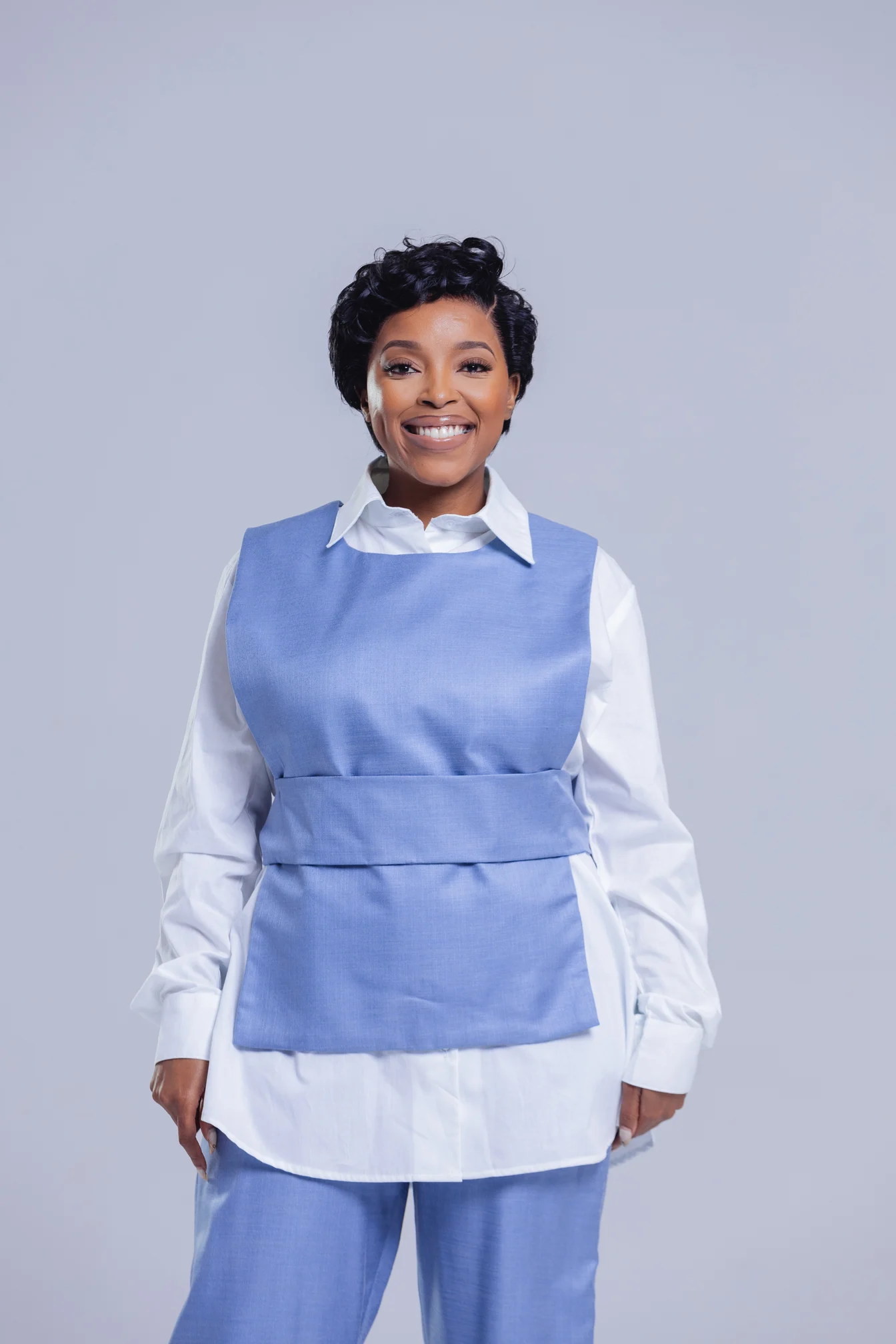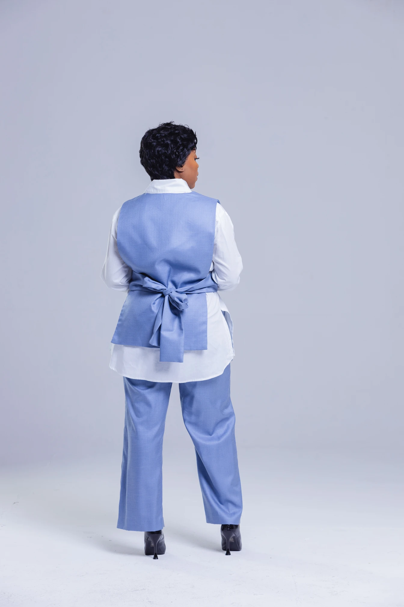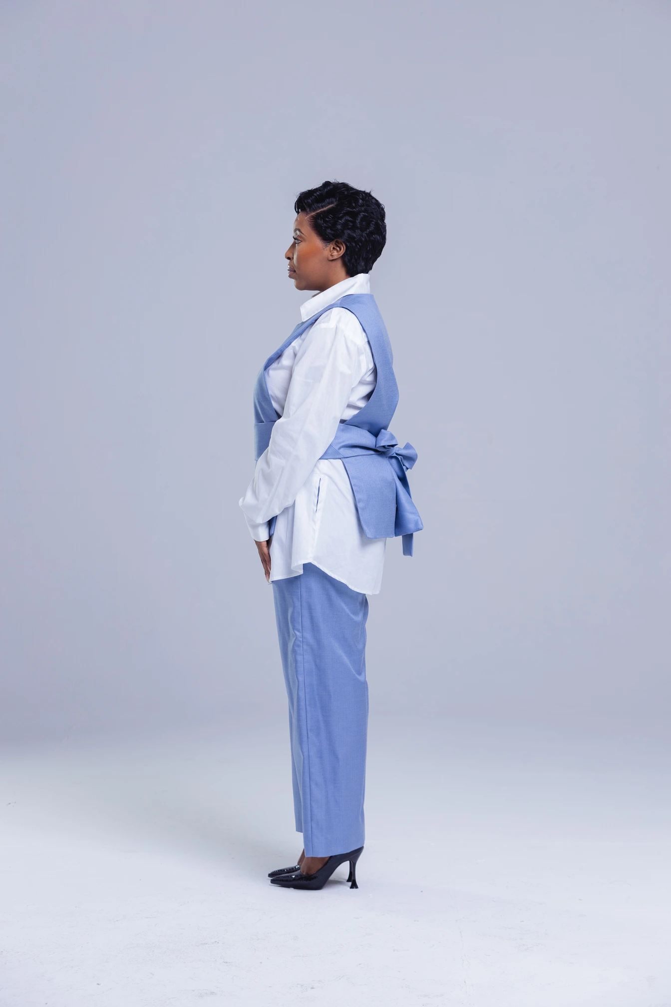 Discover contemporary sophistication with the Azure Grace Two-Piece Set — a serene sky-blue ensemble that balances clean tailoring with modern femininity. Featuring a sculpted overlay top, tailored trousers, and a crisp white shirt.