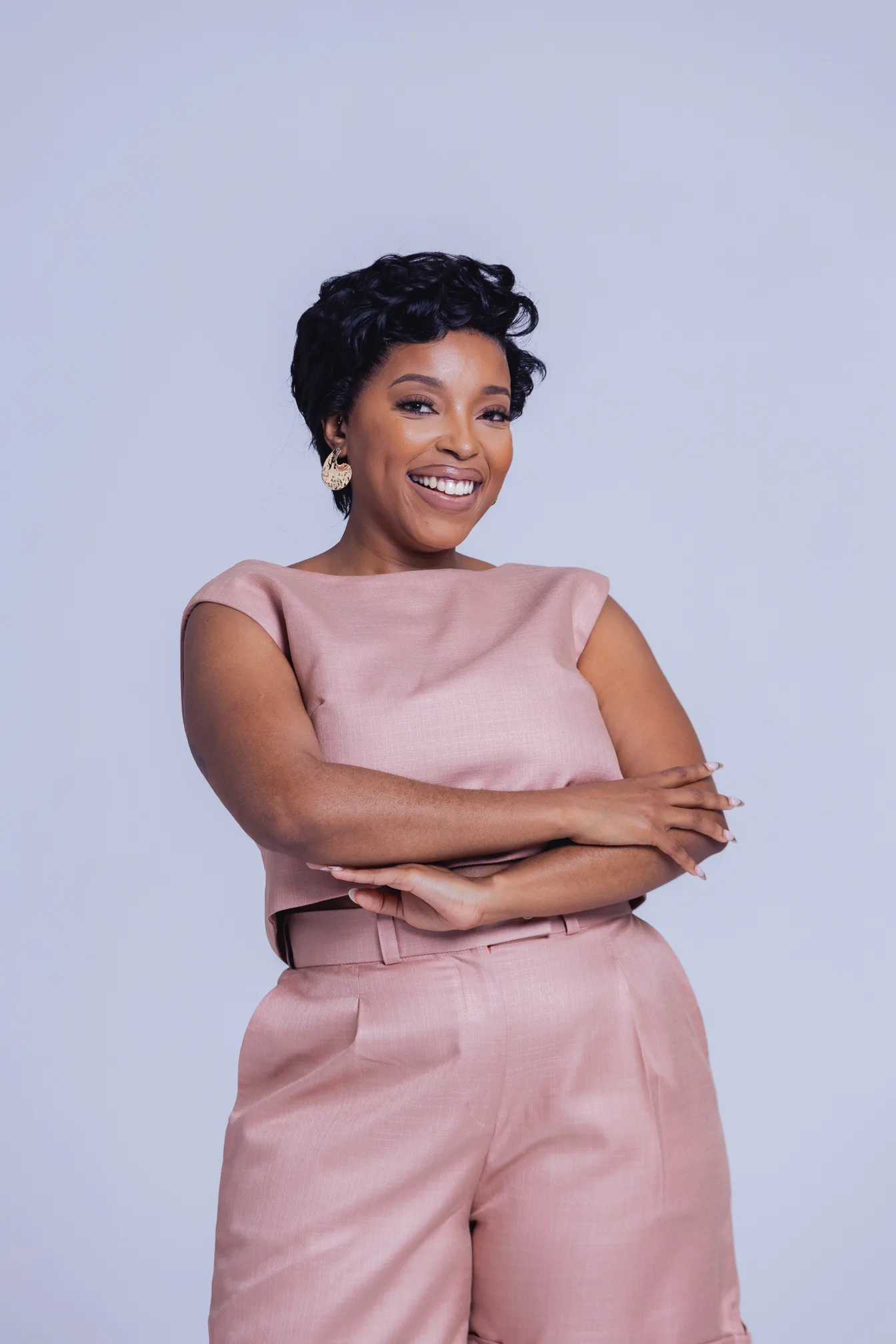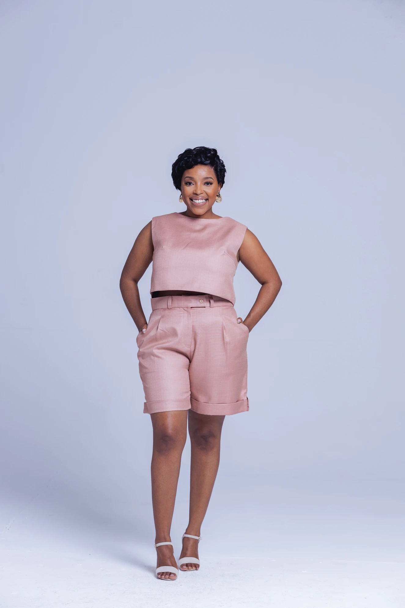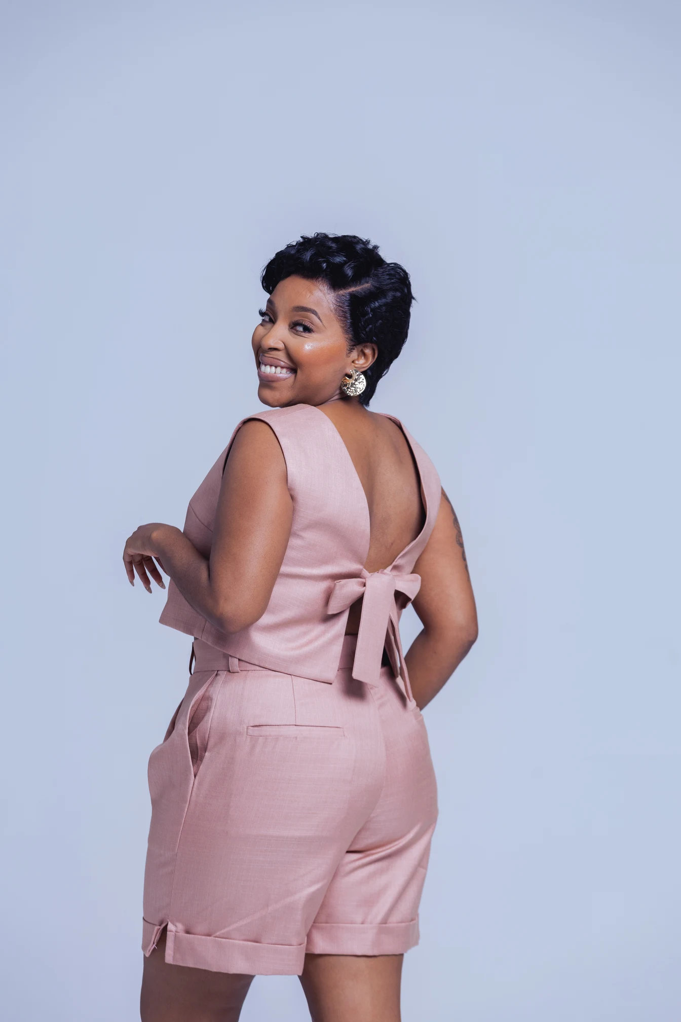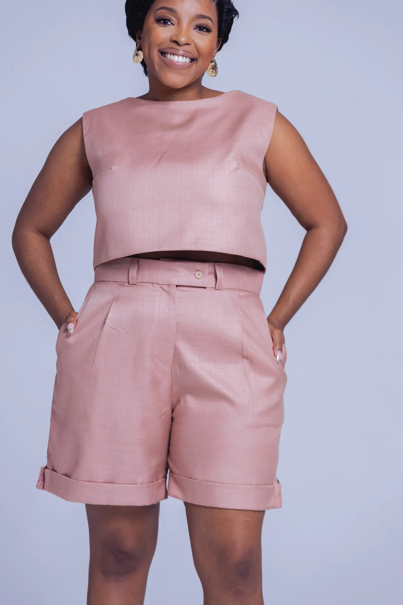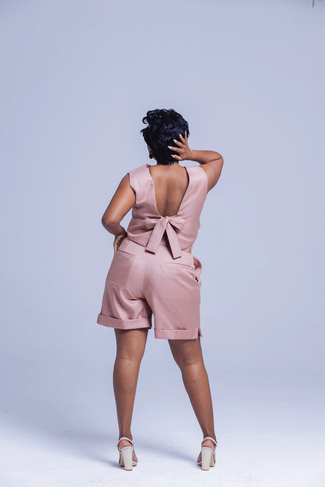 Blush is a refined two-piece ensemble designed for the modern woman. Crafted in a soft rose-blush hue, it includes a structured sleeveless top with a deep V-back and bow tie, paired with tailored high-waisted shorts.
