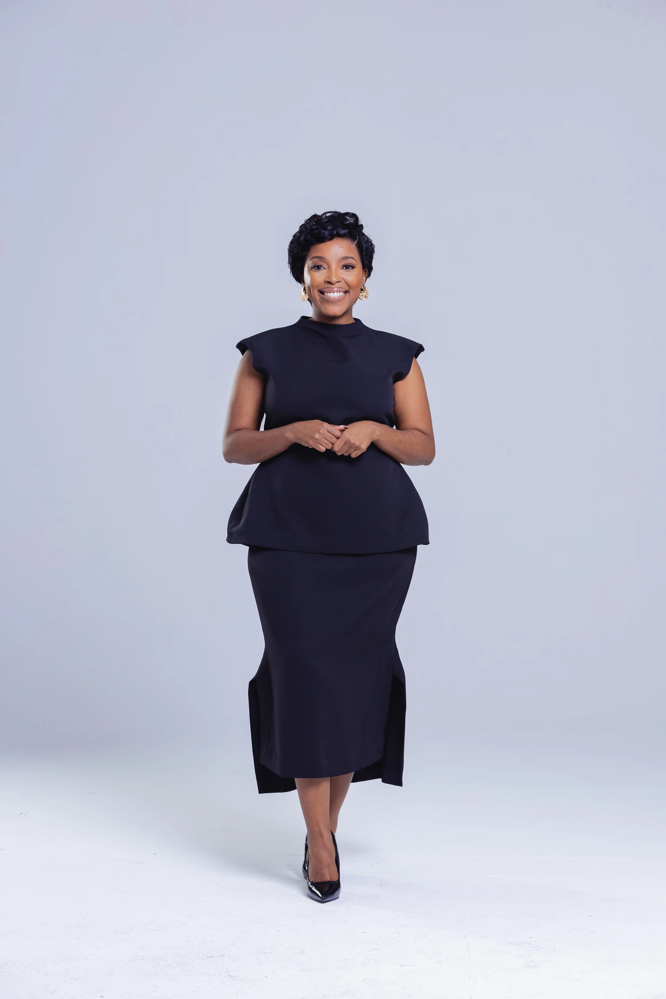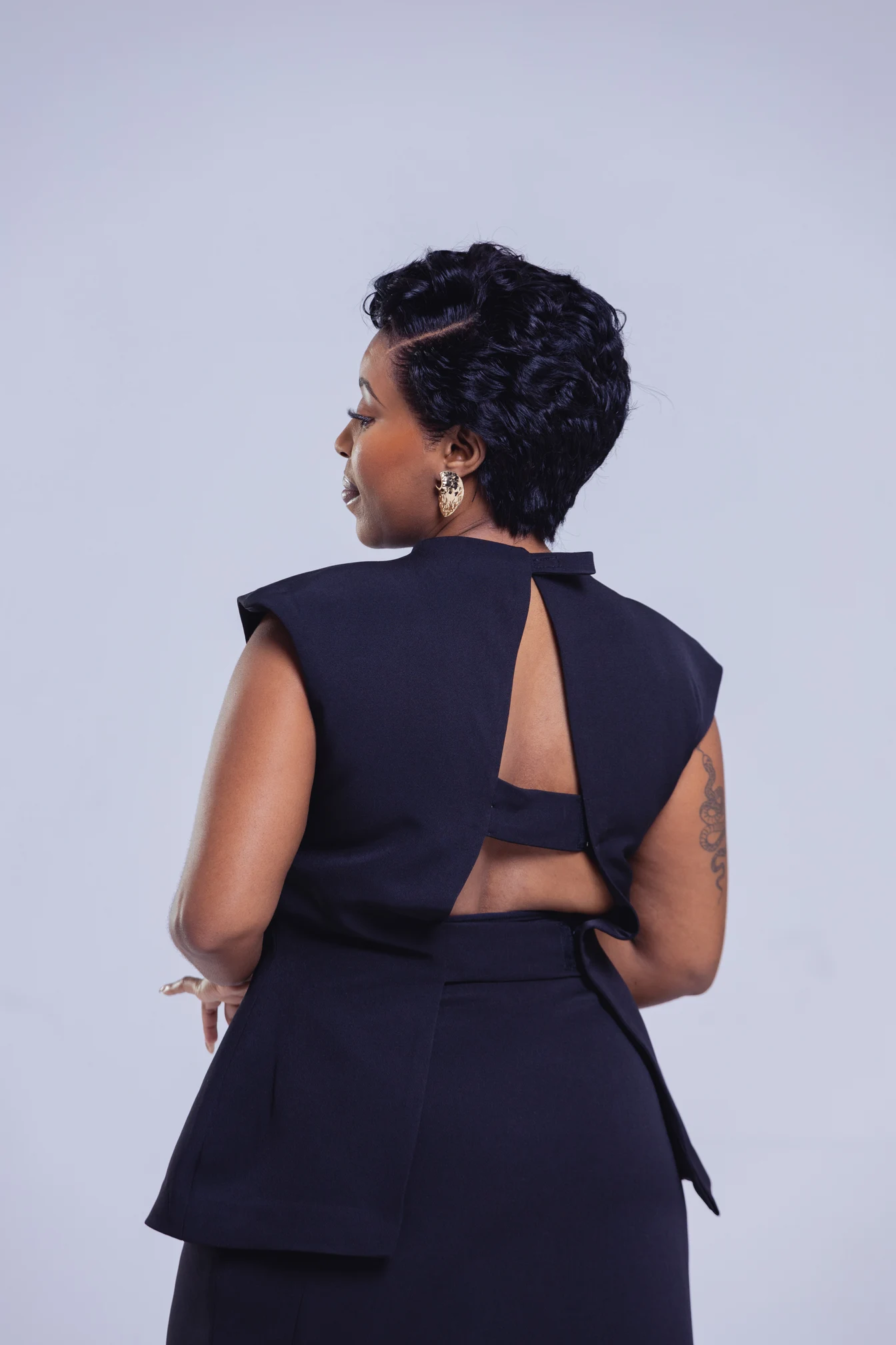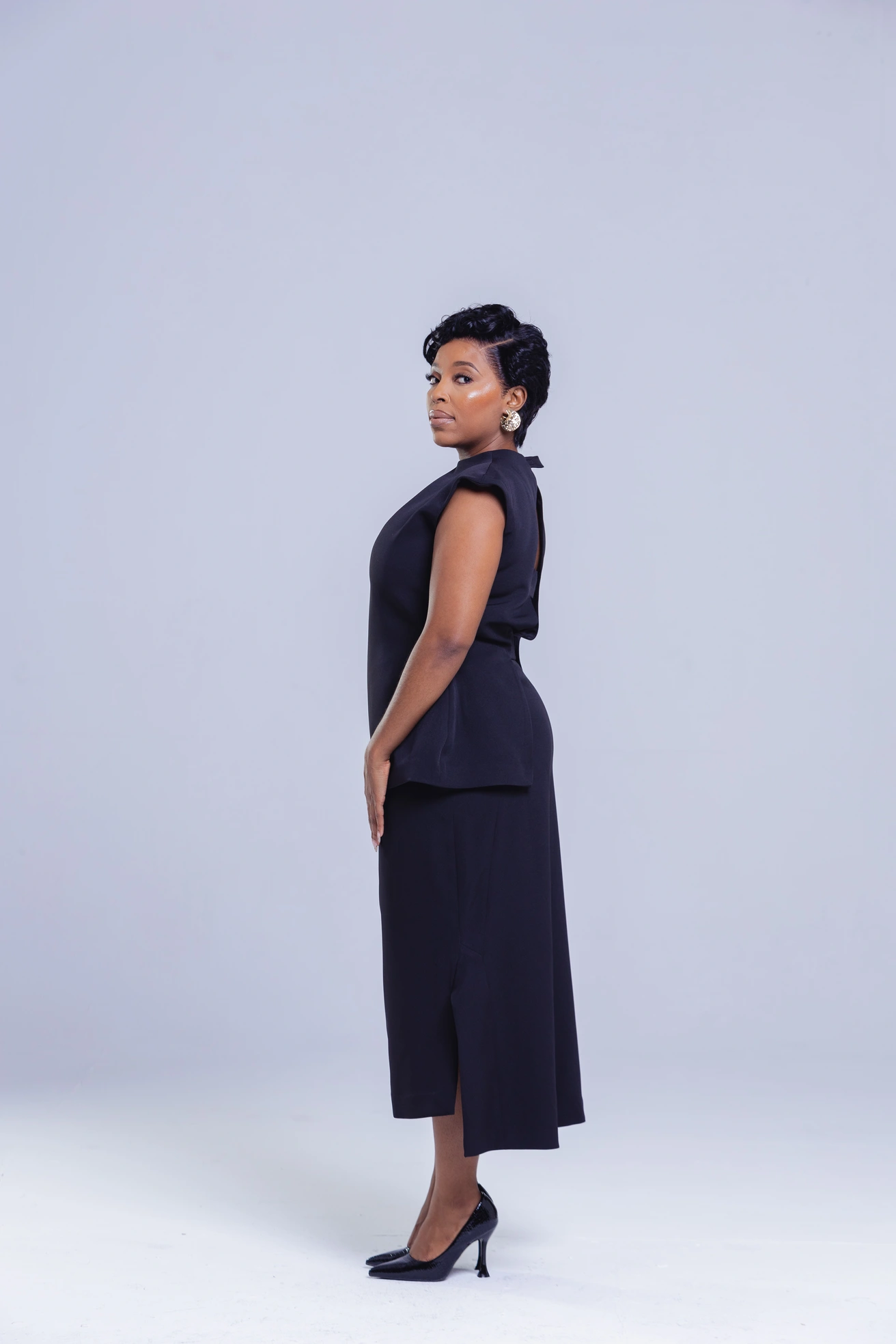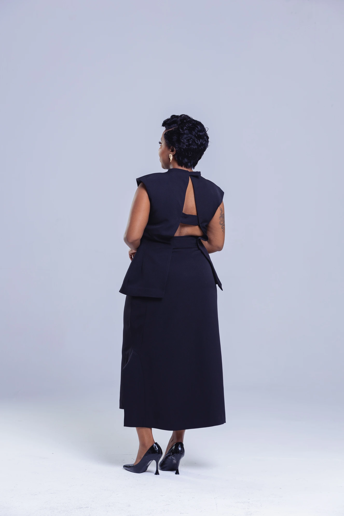 Step into sophistication with our Elegant Black Structured Two-Piece Set — a timeless ensemble that blends classic tailoring with contemporary flair. The look features a sculpted cap-sleeve top with a unique open-back tie detail, paired with a high-waisted midi skirt that flows with poise and confidence.