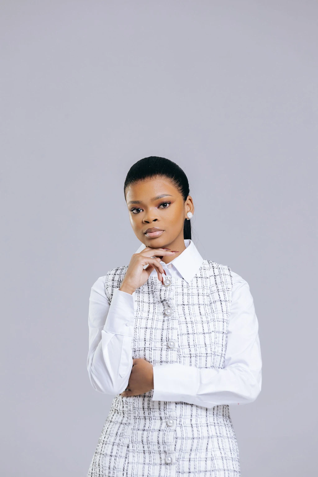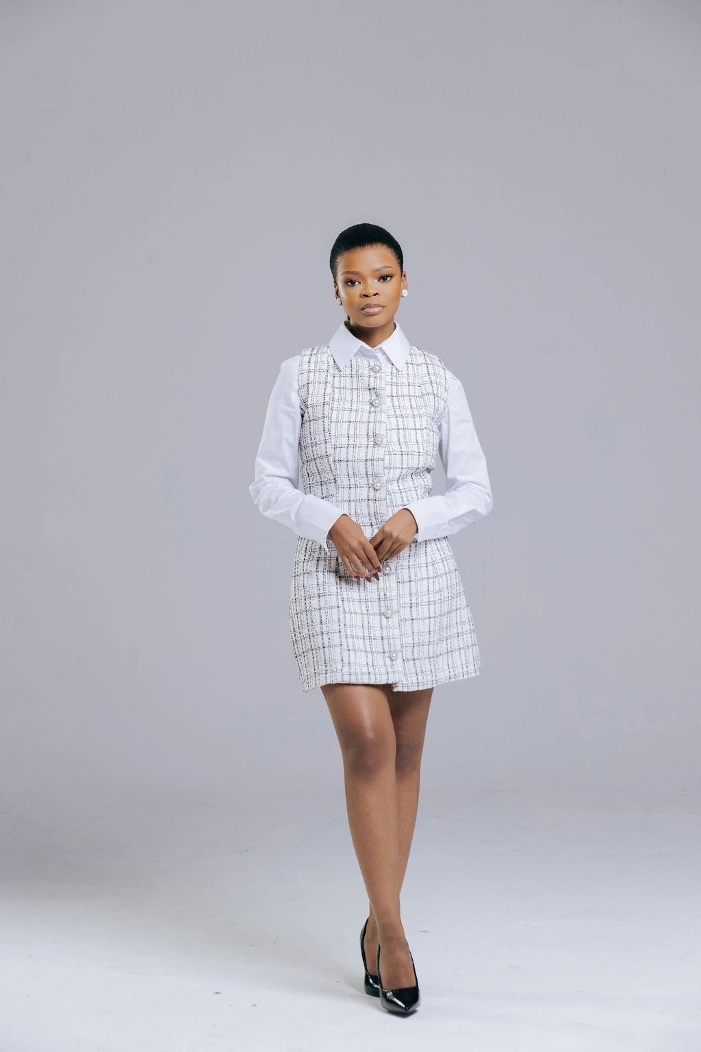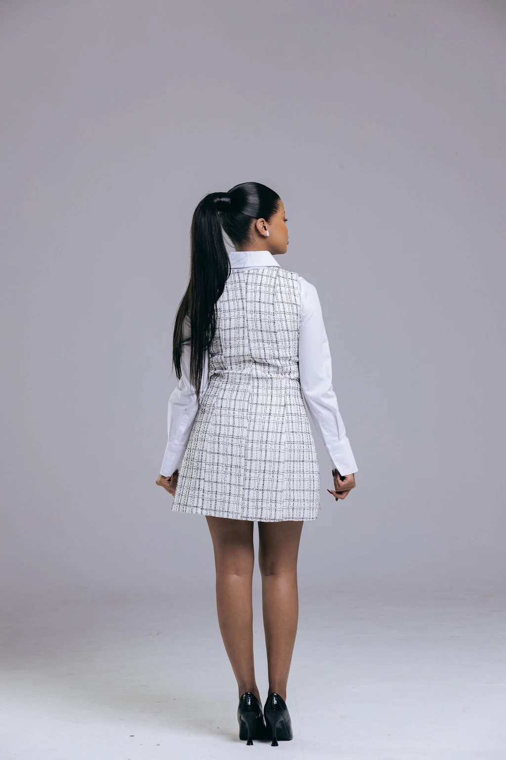 This is a tweed dress coat. It has a classic woven texture in black and white with bits of gold. The collar and cuffs are a contrasting black satin, giving it a polished look